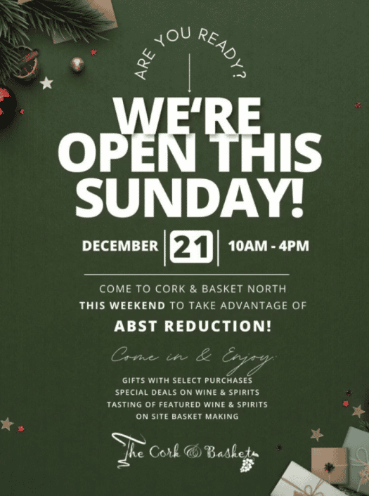 To make your holiday shopping even easier, we will be open this Sunday from 10:00 AM to 4:00 PM exclusively for the sale. Stock your cellar, find thoughtful gifts, and enjoy a festive shopping experience. See you this weekend!