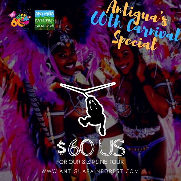 In celebration of Antigua Carnival's 60th edition, Antigua Rainforest Canopy Tours is offering their 8 zip-line tour for a reduced price of US$60.