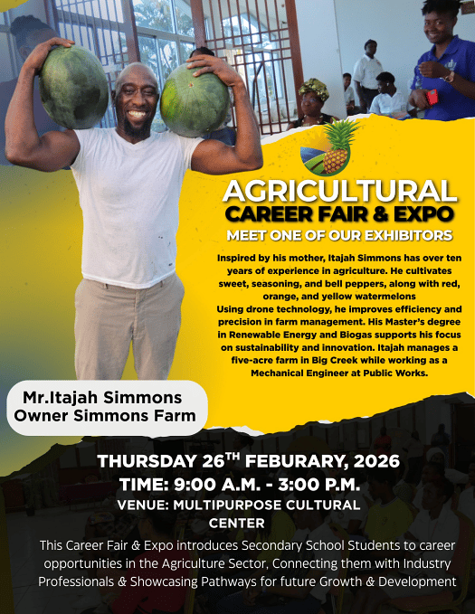 Meet Mr. Itajah Simmons – Exhibitor Spotlight Owner of Simmons Farm, Mr. Simmons brings over a decade of hands-on experience in cultivating sweet, seasoning, and bell peppers, as well as vibrant red, orange, and yellow watermelons. With a Master’s in Renewable Energy and Biogas and cutting-edge drone technology on his five-acre farm in Big Creek, he’s redefining modern farming. He also serves as a Mechanical Engineer at Public Works—proof that agriculture and engineering go hand in hand!
