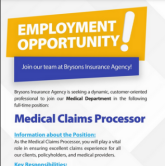 | JOB VACANCY: MEDICAL CLAIMS PROCESSOR Tuesday 1st April 2025 We have an employment opportunity available at Brysons Insurance Agency for a Medical Claims Processor. If you meet the requirements we want to here from you. Read More