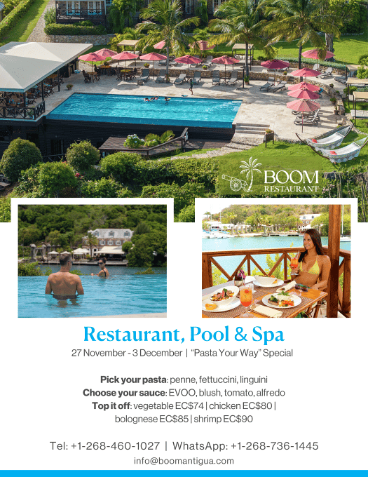 Thursday 27th November 2025, 12pm.  Pick your pasta, choose a sauce, and add a vegetable or protein topper. Boom Day Pass available for US$90 (+ 10% Service). Offer includes a two-course lunch, a drink, a sun lounger, and infinity pool access. Turn your Day Pass into a Spa-cation by adding a 50-minute massage for US$80 (+ 10% Service).