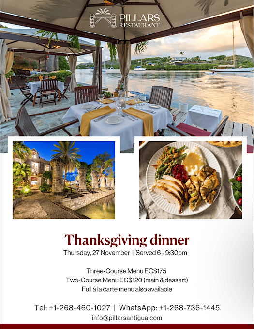 Celebrate Thanksgiving with us! Enjoy a three-course meal for EC$175 or a two-course meal for EC$120, or explore our full à la carte menu. Served from 6:00–9:30 PM on Thursday, 27 November, it’s the perfect way to give thanks with great food and company.