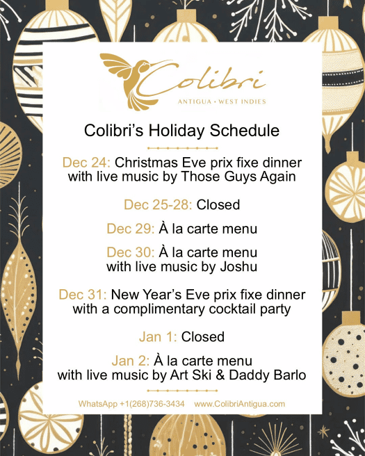 Colibri, Antigua, has released its holiday dining schedule, featuring a Christmas Eve prix fixe dinner with live music on December 24, followed by à la carte dining on December 29 and 30, with live performances on select nights.
