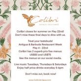 | SUMMER CLOSING Thursday 1st May 2025 Join us for Antigua & Barbuda Restaurant Week and enjoy two exquisite prix fixe menus. Colibri closes for summer on May 22 and will re-open in November 2025.—Don’t miss your final chance to indulge! Read More