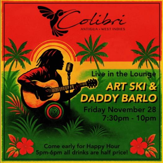 🎶 Live music in the lounge! Join Colibri on 28th November featuring Art Ski and Daddy Barlo. Don’t miss happy hour from 5–6 pm! 🍹