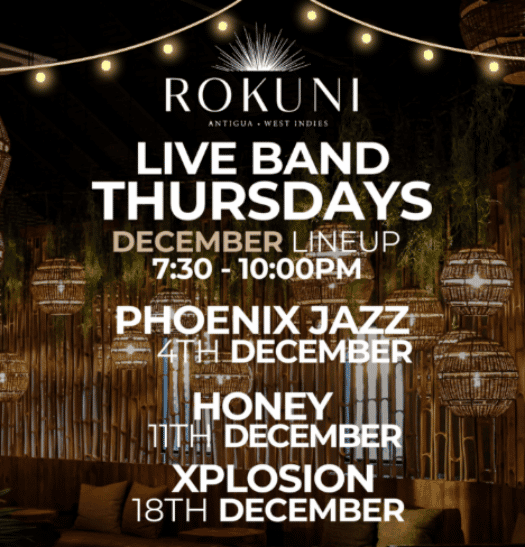 Thursday 4th December 2025.  Enjoy live bands every Thursday from 7:30–10pm, bringing the perfect December vibe to Rokuni’s stunning space. Great music, amazing energy, and that unmistakable Rokuni feel—every Thursday night. 📍 Rokuni, Sugar Ridge, Jolly Harbour 📞 Reservations: +1 (268) 463-6161 Walk-ins welcome!