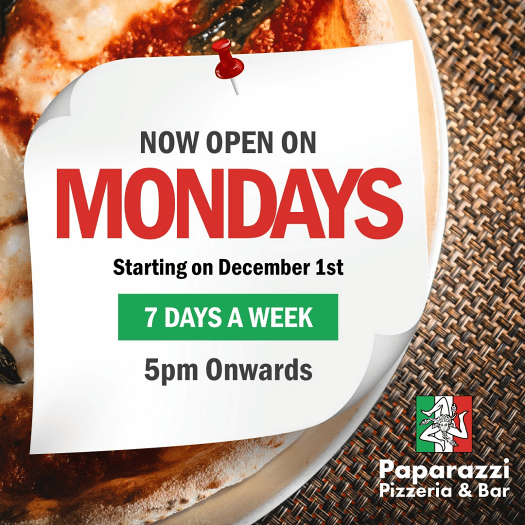 Discover the exciting new opening times at Paparazzi! We are thrilled to announce that we will now be open 7 Days a Week. Stop by and enjoy your favorite Pizza or try something new any day of the week. We look forward to welcoming you!