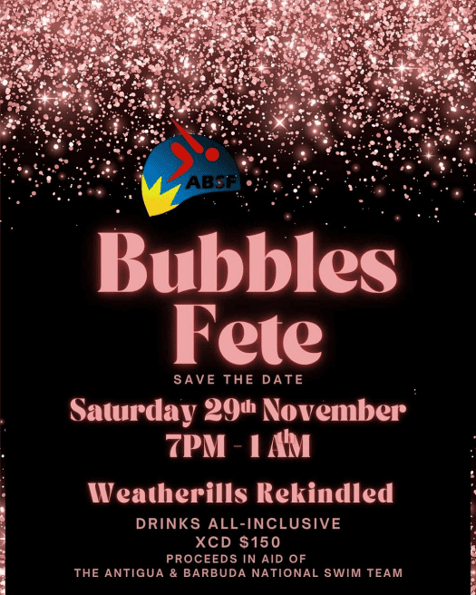 Let’s FETE for a PURPOSE! Join us Saturday, Nov 29th, for The Annual Bubbles Fete — all proceeds support our national swimmers representing Antigua & Barbuda on the international & regional stage! $150 drinks inclusive Bar bites available DJ Kuma & DJ Riddim Master are bringing the heat Doors 7 PM