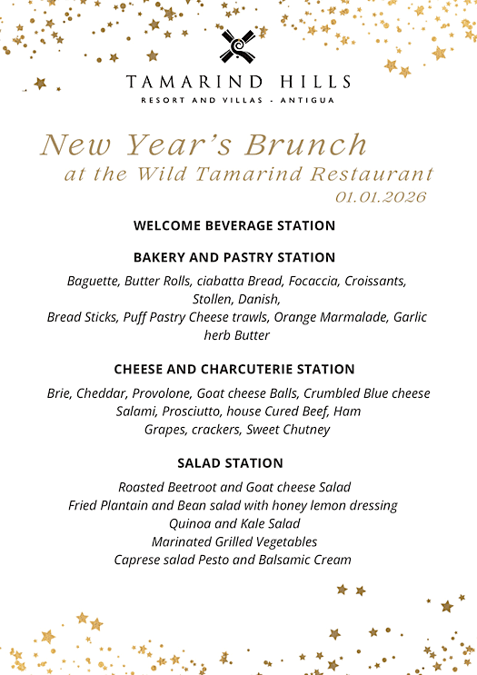 Start 2026 in style at Tamarind Hills Resort and Villas! Join us on January 1st for a New Years Brunch at the Wild Tamarind Restaurant, complete with a welcome beverage station to toast the new year. Celebrate the first day of 2026 with delicious food and a relaxing atmosphere in beautiful Antigua.