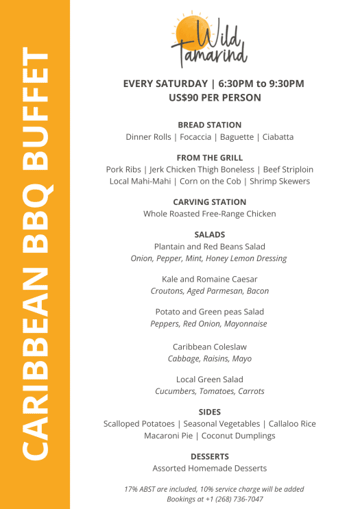 Every Saturday evening, indulge in the vibrant flavors of the Caribbean at our BBQ Buffet, complete with live Steel Band music. Enjoy grilled favorites like jerk chicken, pork ribs, fresh local fish, hearty sides, fresh salads, and delicious homemade desserts—all for US$90 per person. Join us from 6:30 PM to 9:30 PM for an unforgettable night of food, music, and island vibes!