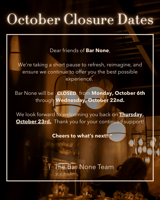 Tuesday 30th September 2025 Bar None is taking a brief break and will be closed starting Monday, October 6th, and reopening on T... Read More