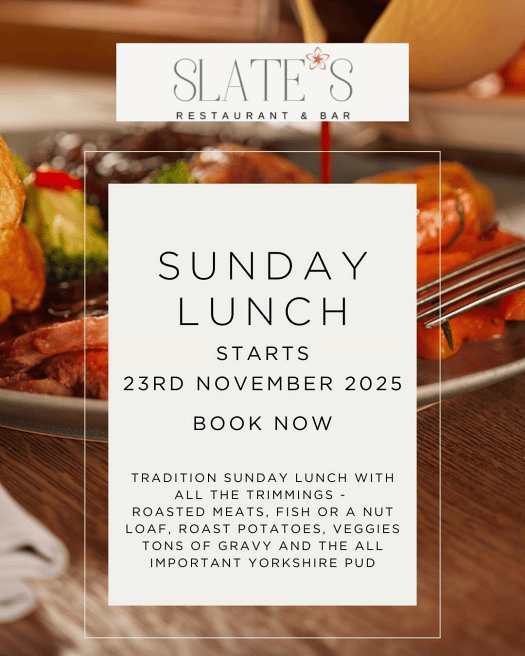 Slate’s Restaurant & Bar is serving up comfort and tradition once again as its popular Sunday Lunch returns on 23rd November 2025. Diners can look forward to hearty plates filled with all the trimmings — from perfectly roasted meats, fish, or a flavourful nut loaf to golden roast potatoes, fresh veggies, rich gravy, and of course, the all-important Yorkshire pudding.