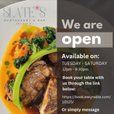 Slate is open and ready to serve! Enjoy delicious meals, great drinks, and friendly service in a relaxed setting. Visit Slate today for your favorite dining experience.