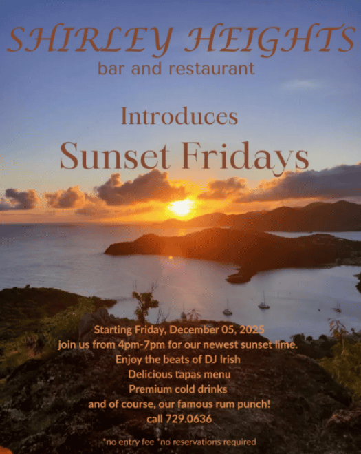 Introducing Sunset Fridays at Shirley Heights! Starting Friday, December 5th, 2025, unwind from 4pm–7pm with breathtaking views and the ultimate golden-hour vibe. Enjoy the beats of DJ Irish, a delicious tapas menu, premium cold drinks, and of course—our famous rum punch.