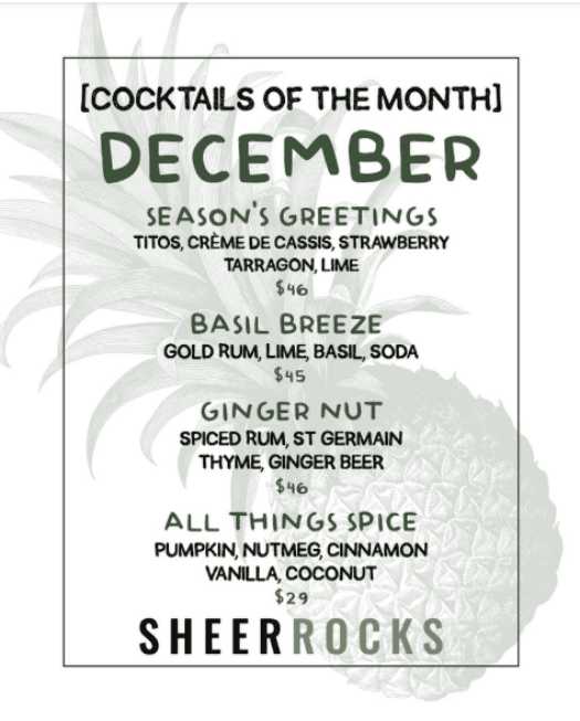 Celebrate December with Sheer Rocks’ specialty cocktails, featuring festive flavors like Season’s Greetings, Basil Breeze, Ginger Nut, and All Things Spice.