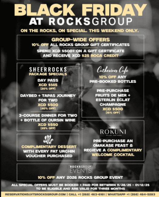 Group-wide perks include 10% off all gift certificates and XCD $25 Roca credit for every XCD $500 spent. Plus, each venue is offering something special, from discounted day passes and complimentary wine at Sheer Rocks, to free desserts at Fat Urchin, bottle discounts at Catherine’s Café, welcome cocktails at Rokuni, and 10% off all 2026 Rocks Group events.