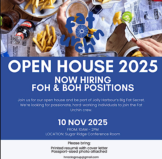 We’re casting the net wide for the island’s best hospitality talent — front and back of house! Drop by the Sugar Ridge Conference Room on Monday, November 10th, 2025, from 10 AM to 2 PM with your résumé, cover letter, and a passport-sized photo. Come make some waves with Fat Urchin and be part of something amazing!