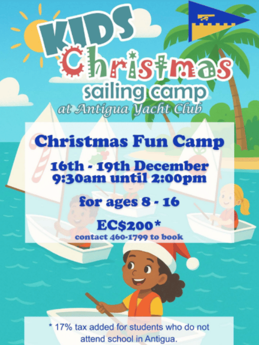 Set sail this holiday season! π€π The Antigua Yacht Club presents its Kids Christmas Sailing Camp, running December 16thβ19th from 9:30AM to 2:00PM. Perfect for young sailors ages 8β16, this fun-filled camp lets kids learn the basics, enjoy the water, and make new friends. Registration now open!!