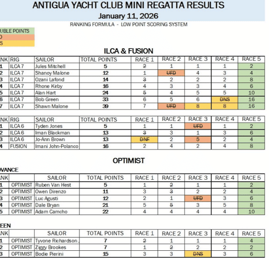The Antigua Yacht Club Mini Regatta, held on January 11, produced close racing and consistent performances across multiple dinghy classes, with sailors competing under the low-point scoring system over five races.