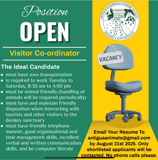 The Antigua Donkey Sanctuary is seeking a dedicated and friendly Visitor Co-ordinator to join our team. If you love animals, enjoy working with people, and have excellent communication and organizational skills, this is the role for you! Apply by August 31st, 2025 at antiguaanimals@gmail.com.