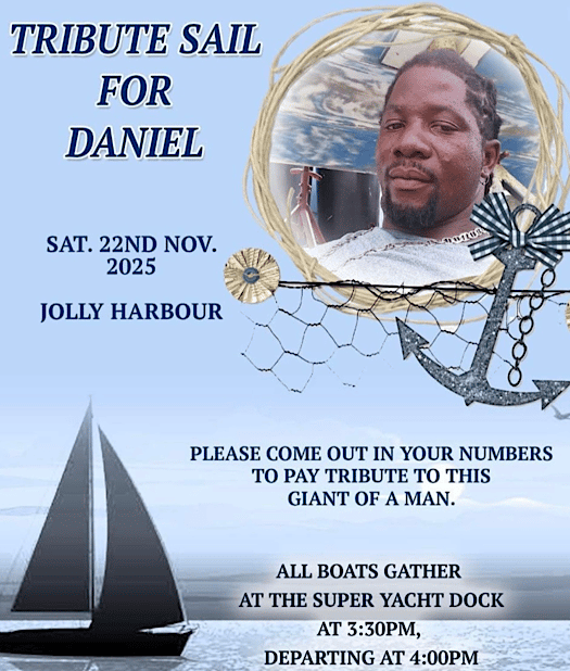 Join family, friends, and the wider maritime community as we honor the life of Daniel, a beloved figure whose spirit touched everyone he met. The Tribute Sail will take place on Saturday, 22nd November 2025 in Jolly Harbour, where boats will gather at the Super Yacht Dock at 3:30 PM, departing together at 4:00 PM.