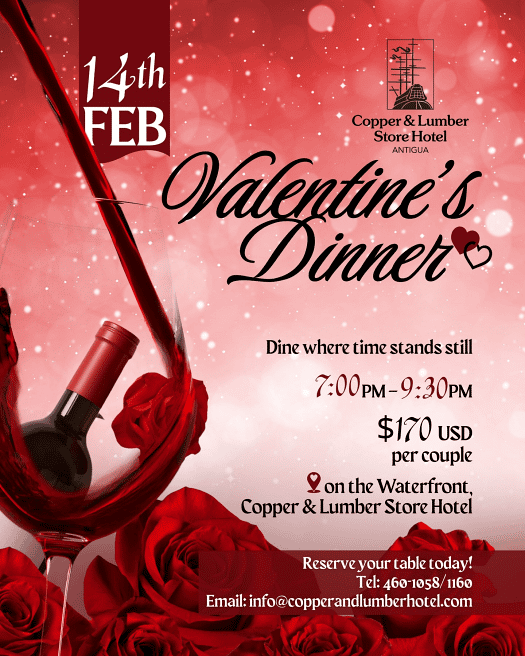 February 14 7:00 PM – 9:30 PM US$170 per couple On the waterfront, Nelson’s Dockyard