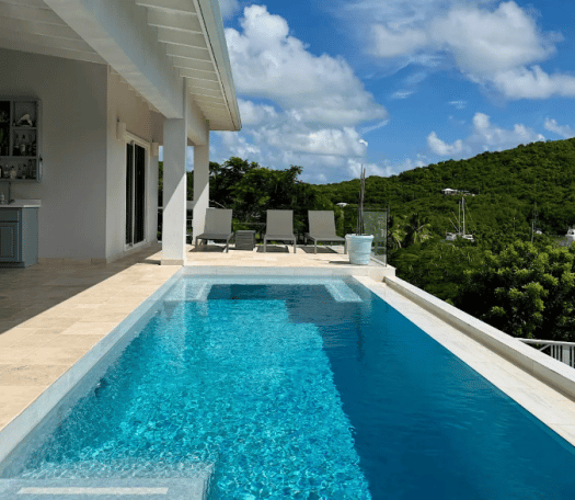 This beautifully constructed two level villa features several essential elements of any quality Caribbean home – including custom built wooden louvered windows and doors for maximum airflow, high beamed ceilings, wide doorways opening onto a spacious exterior deck area, inviting covered view veranda, and ceiling fans to ensure year round, comfortable temperatures throughout. Unobstructed harbour views abound from the main level living area, infinity edge salt water pool with seating, coloured lighting and a cascade waterfall, and sun tanning patios with glass railings.