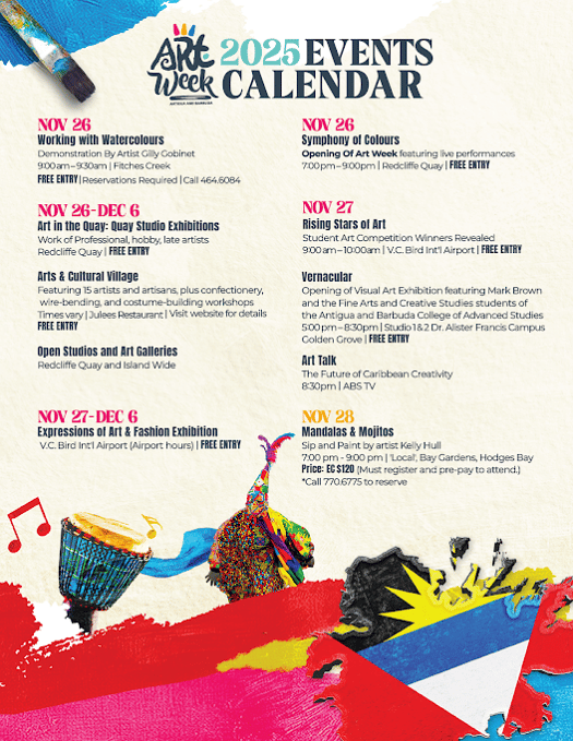 Tickets for the Art and Culture Bus Tours, Rhythm and Vibes, and Canvas and Cocktails are available through the Antigua and Barbuda Tourism Authority at (268) 562-7600 (Art Week registered participants do qualify for special offers) or online via the Ticketing Events App - simply download the app and search for the events.