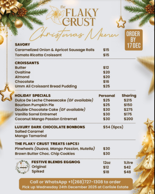 Place your orders by 17 December via WhatsApp: +1 (268) 727-1308 đ Pick-up on Christmas Eve at Carlisle Estate!