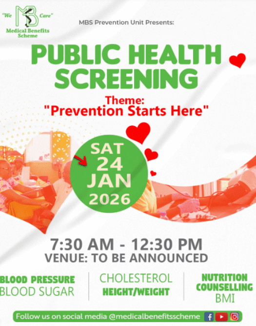 The Medical Benefits Scheme Prevention Unit presents a Public Health Screening on Saturday 24 January 2026 under the theme Prevention Starts Here. Join us from 7:30 AM to 12:30 PM for free health checks and wellness support, including blood pressure, blood sugar, cholesterol, height and weight measurements, BMI, and nutrition counselling. Venue to be announced.