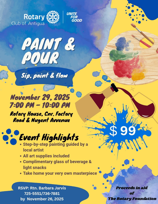 Create for a cause! Join the Rotary Club of Antigua for our Paint & Pour fundraiser. Enjoy a fun, guided painting session while supporting the global and local projects of The Rotary Foundation.