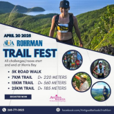 | AUA ROHRMAN TRAIL FEST 2025Wednesday 16th October 2024 Whether you're a beginner looking for a challenge or an elite trail runner pushing your limits, there’s something for everyone at the Rohrman Trail Fest. Read More