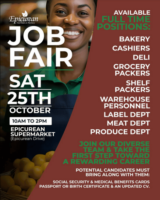 Looking for a new career opportunity? Epicurean Supermarket is hosting a Job Fair this Saturday, October 25th from 10AM to 2PM at Epicurean Drive! We’re hiring for full-time positions in Bakery, Cashier, Deli, Grocery, Warehouse, Label, Meat, and Produce Departments. Bring your CV, Social Security & Medical Benefits Cards, and Passport or Birth Certificate. Join our team and take the first step toward a rewarding career with Epicurean Supermarket!