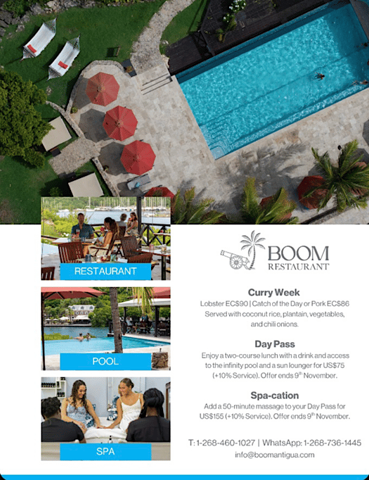 Soak up the sunshine and flavor at Boom Restaurant, open daily for lunch from 12β4 PM! π Donβt miss Curry Week (Nov 6β12) or take advantage of the final days of our Boom Day Pass β just US$75 (+10%) for a two-course lunch, drink, sun lounger, and infinity pool access. Upgrade your escape with a 50-minute massage for US$155 (+10%) before the offer ends on Nov 9.