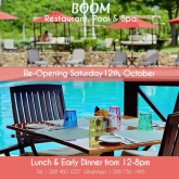 | REOPENING SATURDAY Thursday 9th October 2025 Boom Restaurant, Pool & Spa reopens for lunch on Sunday, October 12th! Read More