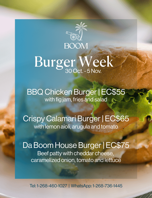Thursday 30th October 2025.  Burger Week Open for lunch 12-4 daily. Join us for Burger Week, 30 October - 5 November! Or, spend the afternoon at Boom with a Day Pass for US$75 + 10% Service.