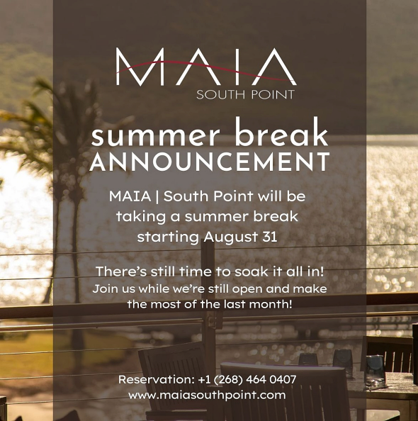 Thank you for an incredible season! MAIA | South Point will be closing for our summer break starting August 31st and will reopen on November 6th, 2025. There’s still time to savor the experience! Join us this month and soak in every last moment before we pause for the season. 📞 Reserve your table today: +1 (268) 464 0407 🌐 www.maiasouthpoint.com Click Here to view Maia_Break.png