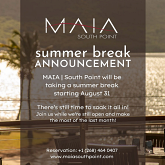 | MAIA OPENING HOURSFriday 4th November 2022 MAIA at South Point is open daily for lunch and dinner. Read More
