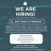| VACANCY FOR GIFT SHOP ATTENDANT Wednesday 8th November 2023 A Boutique Hotel is searching for a Gift Shop Attendant. Apply by November 10th Read More
