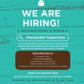 | VACANCY FOR RESTAURANT SUPERVISORWednesday 26th July 2023 A boutique hotel is seeking an experienced restaurant supervisor, responsible for the day-to-day activities of a dynamic restaurant. Read More