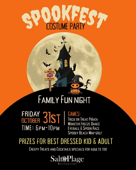 Friday 31st October 2025, 6pm -10pm.  Spookfest is a fun-filled Halloween costume party for the family Beach Games for both adults and kids with prizes for best dressed adult and kid! Book your tables in advance through WhatsApp for dinner! +1 (268) 732-4979