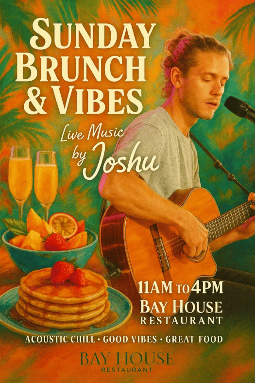Join us this Sunday from 11 AM to 4 PM for a soulful brunch experience featuring live acoustic music by Joshu Indulge in mouthwatering brunch favorites, savor mimosas, and bask in the island vibes. Whether you are coming with friends, family, or flying solo, good food, good music, and good vibes are guaranteed.