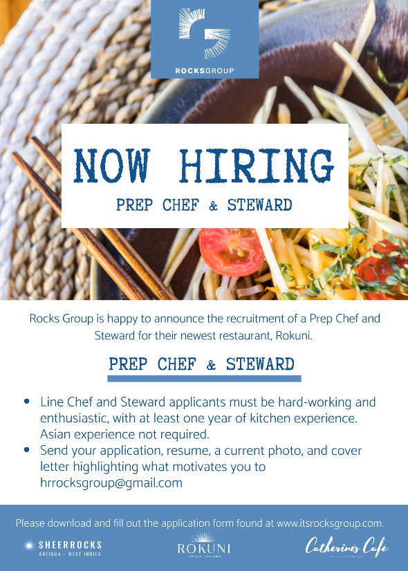 The Rocks group is happy to announce the recruitment of a Prep Chef and a Steward for Rokuni. Send your cover letter and resume to hrrocksgroup@gmail.com