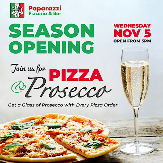 Join us as we kick off the season in style — enjoy a free glass of Prosecco with every pizza! 🍕🥂