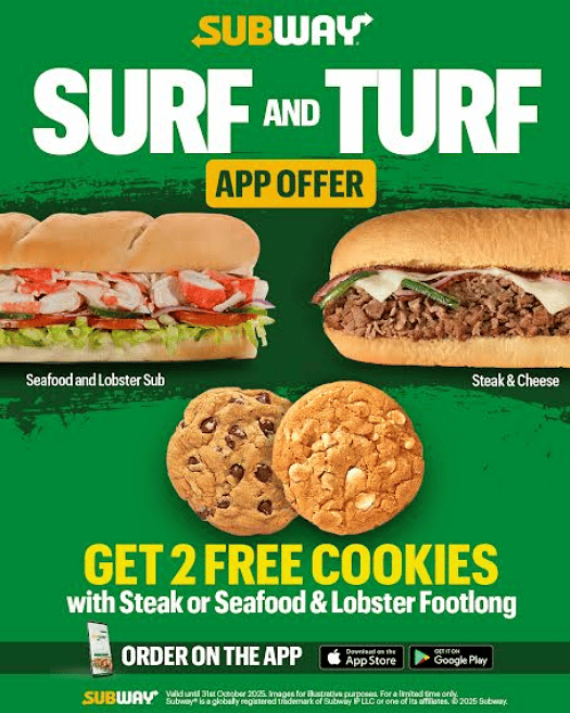 2 Free Cookies with Steak or Seafood & Lobster Footlong