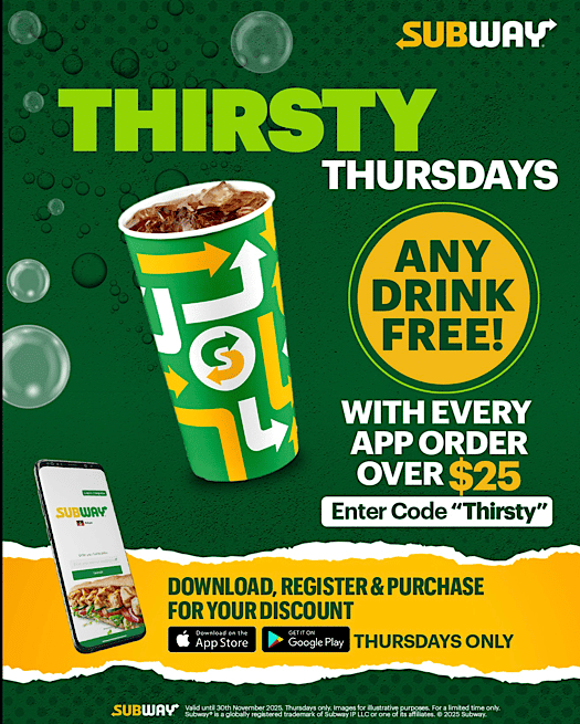 Every Thursday, quench your thirst with a FREE drink on any app order over $25 — just use code THIRSTY at checkout. 💧