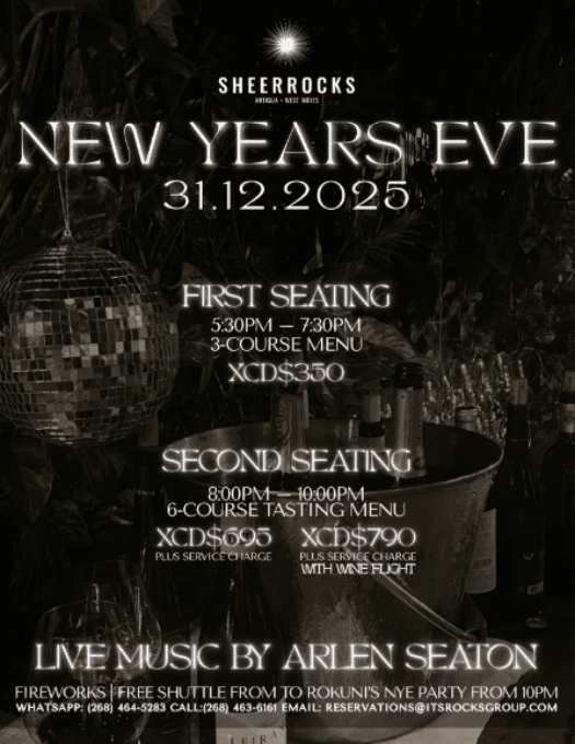 First Seating (5:30–7:30pm): 3-course dinner — XCD$350 + service