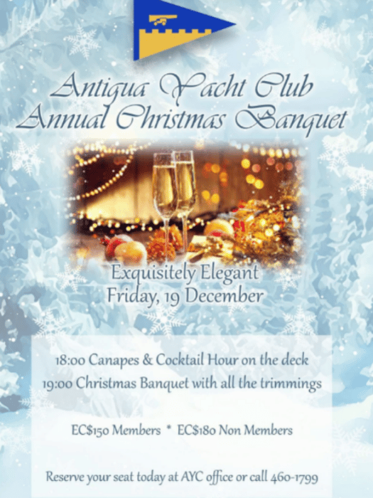 The Antigua Yacht Club invites you to an exquisitely elegant Annual Christmas Banquet on Friday, December 19. Enjoy canapés and cocktails on the deck followed by a festive Christmas feast with all the trimmings. An unforgettable holiday evening for members and guests.