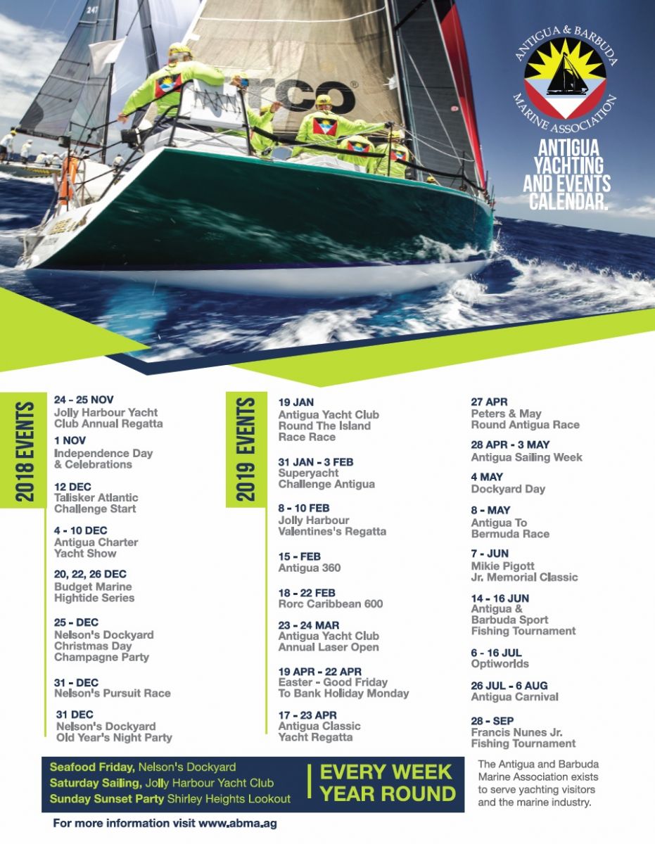 The ABMA has released their 2018 – 2019 Antigua & Barbuda Yachting & Events Calendar, shown below.