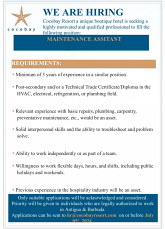 Cocobay Resort has a position opening for a Maintenance Assistant. See details in attached flyer.